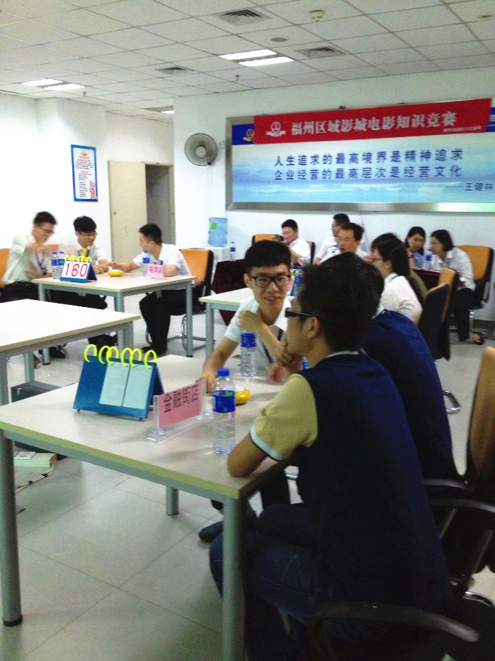 为此2015年9月10日,在福州金融街万达影城里举办了2015年福州区域万达影城“电影放映知识比赛”。活动以福州区域内四家影城各为单位,共计组成4个参赛小组参加。本次比赛历时半天,通过必答题、我说你猜、抢答题和问答题四个方块展开了角逐,从电影专业知识方面、放映的专业知识、到趣味猜图,展示了各店代表队的综合能力,现场气氛活跃,让所有的参赛队都发挥出各自的水平。最终,经过评委们公正、公平的判决,金融街万达影城代表队脱颖而出,拿到了本次区域比赛的冠军,同时金融街万达影城的代表队员林子腾也获得了本次电影达人奖。