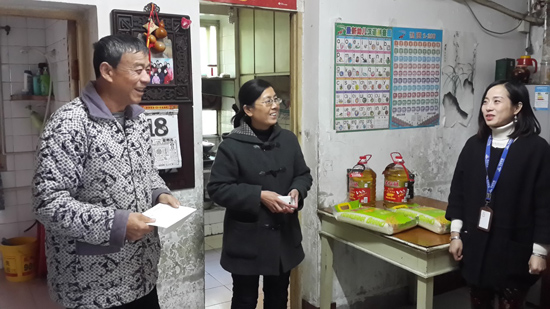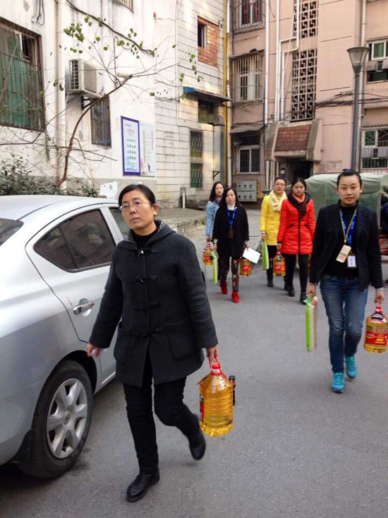 2015年12月18日,合肥万达影城组织义工们带着采购的食用油和大米以及影城员工的爱心捐款来到雨花桥社区春雨花园小区看望街道孤寡老人,送上影城全体员工的关爱。