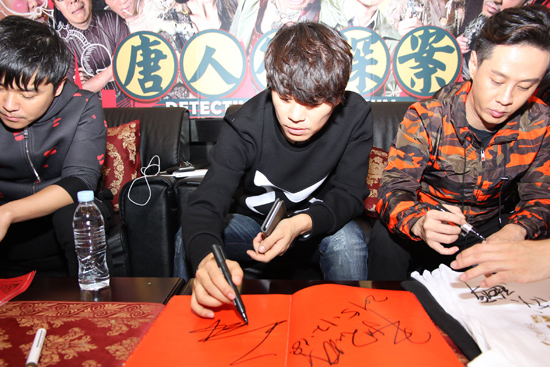 尽管舟车劳顿,几位主创仍然表现出十足的热情,与影迷现场互动问答,现场还将签名T恤、眼镜及电影衍生品一一赠送影迷,当天最大的亮点来自一对新婚夫妇,甜蜜的小两口当天领证,陈导笑言:《唐人街探案》变成了《唐人街爱怀故事》,现场小两口还用韩语表达了对影片《唐人街探案》的好评。现场还有“宝宝”的超级粉丝,当场最小影迷,陈导戏称“宝宝”是孩子杀手。