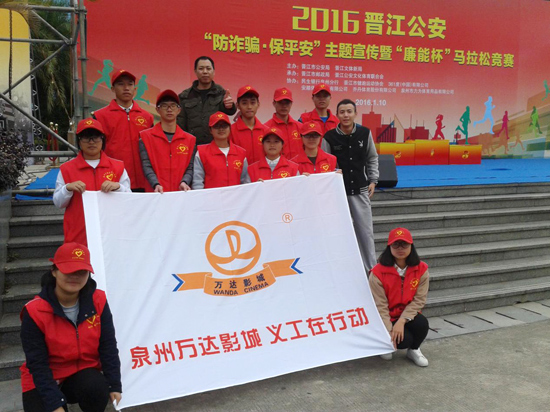 1月10日,泉州万达影城组织员工参加2016年晋江公安“防诈骗保平安”主题宣传暨“廉能杯”马拉松竞赛义工活动。