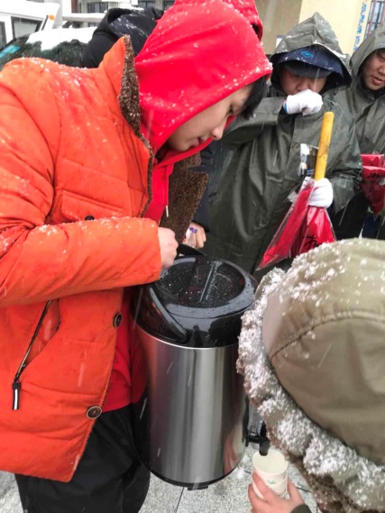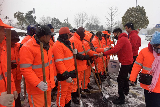 大雪无情人有情,万达电影合肥区域万达文化旅游城店为了对环卫工作人员表示感谢,组织影城员工冒雪将热饮、手套以及围巾等防寒抗冻物资,送给在暴雪天气下进行道路清障工作的合肥市滨湖区万年埠街道环卫工人以及城管工作人员。感谢环卫工作人员的辛劳付出。