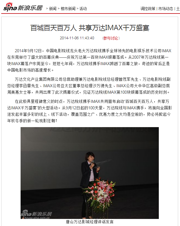 2014年9月12日,中国电影院线龙头老大万达院线携手全球领先的电影娱乐技术公司IMAX在东莞举行了盛大的百幕庆典——庆祝万达第一百块IMAX银幕落成。从2007年万达院线第一块IMAX幕落户东莞至今,短短七年间,万达院线携手IMAX跨越了百幕之旅,奇迹的背后正是中国电影市场的高速增长。
