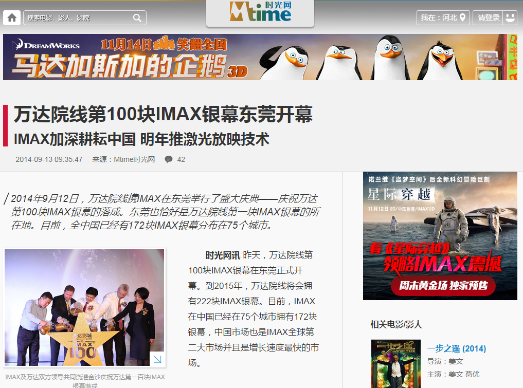 昨天,万达院线第100块IMAX银幕在东莞正式开幕。到2015年,万达院线将会拥有222块IMAX银幕。目前,IMAX在中国已经在75个城市拥有172块银幕,中国市场也是IMAX全球第二大市场并且是增长速度最快的市场。