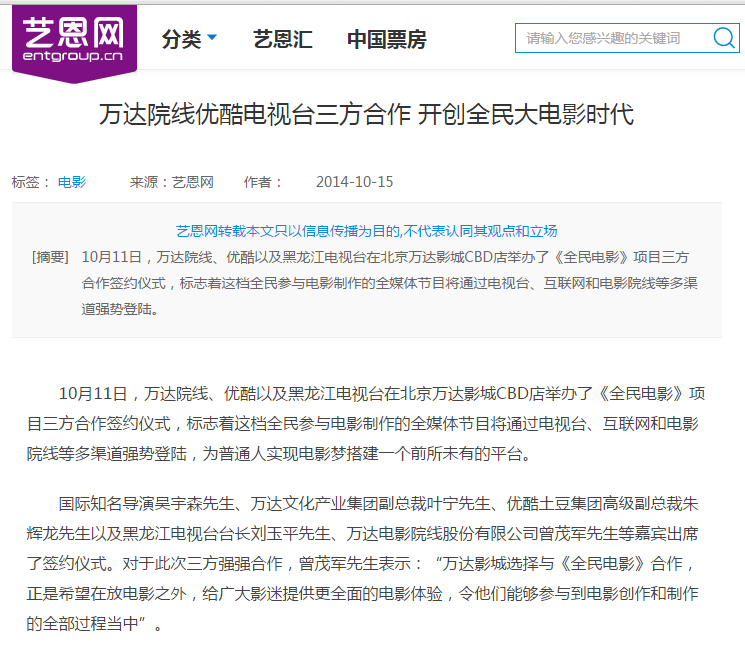 10月11日,万达院线、优酷以及黑龙江电视台在北京万达影城CBD店举办了《全民电影》项目三方合作签约仪式,标志着这档全民参与电影制作的全媒体节目将通过电视台、互联网和电影院线等多渠道强势登陆,为普通人实现电影梦搭建一个前所未有的平台。