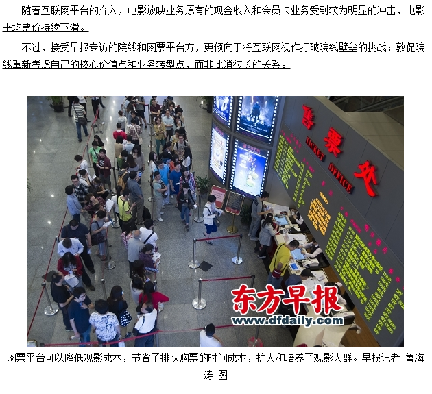 不过,接受早报专访的院线和网票平台方,更倾向于将互联网视作打破院线壁垒的挑战:敦促院线重新考虑自己的核心价值点和业务转型点,而非此消彼长的关系。