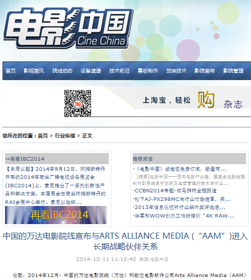 伦敦,2014年12月- 中国的万达电影院线(万达)和数位电影软件公司Arts Alliance Media(AAM)已经宣布,他们进入了一个长期的战略合作伙伴关系。此次合作将看到AAM作为一个主要的技术合作伙伴,将与万达共同致力于不断提高效率,增加收入,和提升整个万达的影院技术同时提升客户体验。此次合作涵盖了现有业务和未来的发展。
