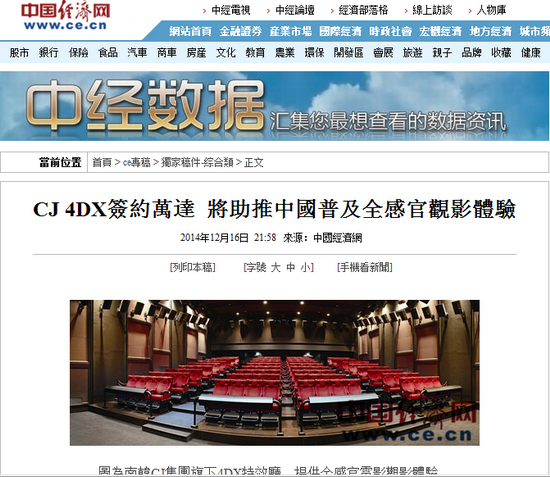 近日,在全亚洲最大的电影展会Cine Asia期间,全球首家4D电影商业公司CJ 4DPLEX与国内市场份额第一的院线—万达电影院线签订4DX特效厅试运营协议,根据协议,双方将于明年2月在大连的万达港汇店开业第一个4DX特效厅,接下来还将在上海、长春等地陆续建设5个4DX特效影厅。