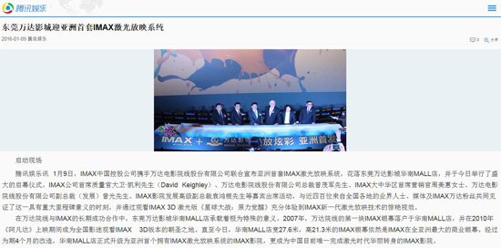 腾讯娱乐讯 1月9日,IMAX中国控股公司携手万达电影院线股份有限公司联合宣布亚洲首套IMAX激光放映系统,花落东莞万达影城华南MALL店,并于今日举行了盛大的启幕仪式。IMAX公司首席质量官大卫·凯利先生(David Keighley)、万达电影院线股份有限公司总裁曾茂军先生、IMAX大中华区首席营销官周美惠女士、万达电影院线股份有限公司副总裁(发展)曾光先生、IMAX影院发展高级副总裁袁鸿根先生等嘉宾出席活动,与近四百位来自全国各地的业界人士、媒体及IMAX万达粉丝共同见证了这一具有重大里程碑意义的时刻,并通过观看IMAX 3D 激光版《星球大战:原力觉醒》充分体验到IMAX新一代激光放映技术的惊艳视效。