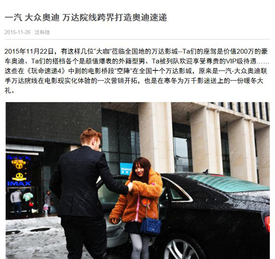 2015年11月22日,有这样几位“大咖”莅临全国地的万达影城--Ta们的座驾是价值200万的豪车奥迪、Ta们的搭档各个是颜值爆表的外籍型男、Ta被列队欢迎享受尊贵的VIP级待遇……这些在《玩命速递4》中到的电影桥段“空降”在全国十个万达影城,原来是一汽-大众奥迪联手万达院线在电影现实化体验的一次营销开拓,也是在寒冬为万千影迷送上的一份暖冬大礼。