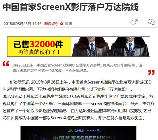 2015年8月26日上午,中国首家ScreenX放映厅在北京万达影城CBD店6号厅华丽启幕。万达电影院线股份有限公司(以下简称“万达院线”,002739.SZ)总裁曾茂军先生与韩国CJ CGV总裁徐定先生出席了启幕仪式并致辞,为观众揭启了中国第一个270度、三面环绕银幕——ScreenX的神秘面纱。当天,主办方还宣布了一个足以令影迷激动的消息:由万达影业出品的年度奇幻巨制《鬼吹灯之寻龙诀》将成为中国第一部以ScreenX格式上映的影片,预计在贺岁档与观众见面。