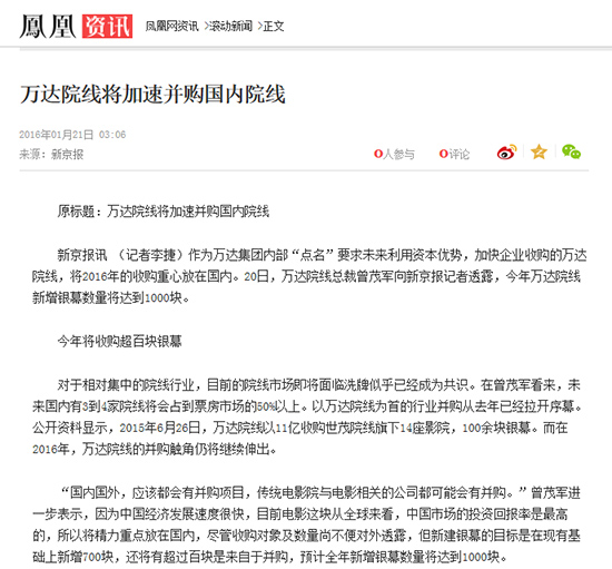 新京报讯 (记者李捷)作为万达集团内部“点名”要求未来利用资本优势,加快企业收购的万达院线,将2016年的收购重心放在国内。20日,万达院线总裁曾茂军向新京报记者透露,今年万达院线新增银幕数量将达到1000块。