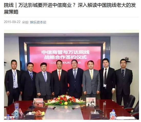 在中信地产官方网站看到,目前中信地产已确立“立足环渤海、泛珠三角、长三角、成渝、长江中游,重点在经济发达的一、二线城市深耕发展”的战略布局。素来以高大上的项目著称的中信公司,无疑将为万达院线扩大在一、二线城市的新项目提供助力。记者致电万达院线相关业务部门负责人透露,中信地产在全国已拥有30多个城市开发房地产项目,现与万达院线潜在合作项目有9个。