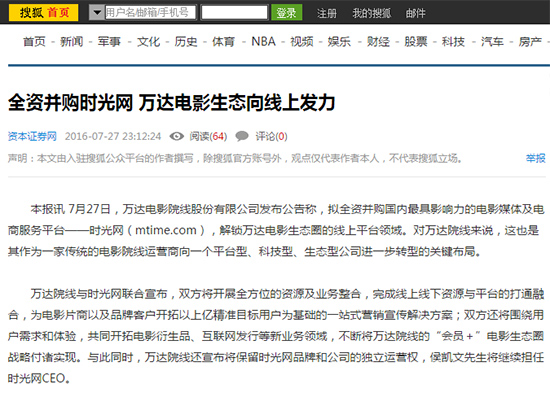 本报讯 7月27日,万达电影院线股份有限公司发布公告称,拟全资并购国内最具影响力的电影媒体及电商服务平台——时光网(mtime.com),解锁万达电影生态圈的线上平台领域。对万达院线来说,这也是其作为一家传统的电影院线运营商向一个平台型、科技型、生态型公司进一步转型的关键布局。