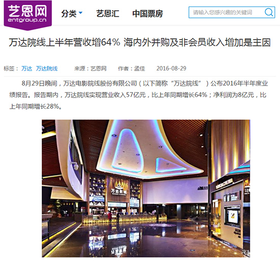 8月29日晚间,万达电影院线股份有限公司(以下简称“万达院线”)公布2016年半年度业绩报告。报告期内,万达院线实现营业收入57亿元,比上年同期增长64%;净利润为8亿元,比上年同期增长28%。