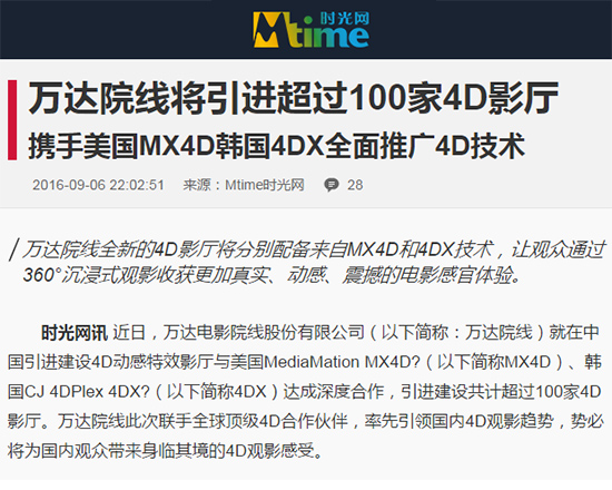 当前电影体验方式越来越呈现多样化,能够同步上映国内外商业大片的4D影院成为众多观影体验中最受青睐的一种。2015年初,万达院线与MediaMation公司在广西南宁万达影城青秀店成功合作了国内第一个MX4D影厅,并于同年2月在大连港汇店引进首家CJ 4DPlex 4DX影厅,将好莱坞级的全感官电影体验引入中国,实现了口碑和票房齐飞。