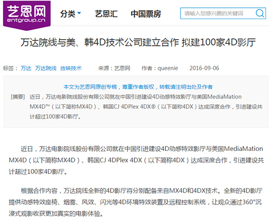 当前电影体验方式越来越呈现多样化,能够同步上映国内外商业大片的4D影院成为众多观影体验中最受青睐的一种。2015年初,万达院线与MediaMation公司在广西南宁万达影城青秀店成功合作了国内第一个MX4D影厅,并于同年2月在大连港汇店引进首家CJ 4DPlex 4DX影厅。到今年年底,万达院线将成为国内拥有最多4D影院的院线公司。