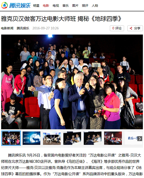 腾讯娱乐讯 9月26日,备受国内电影爱好者关注的“万达电影公开课”之雅克-贝汉大师班在北京万达影城CBD店开讲。曾执导《鸟的迁徙》、《海洋》等多部优秀作品的世界纪录片大师——雅克·贝汉以及雅克·克鲁佐作为本期主讲嘉宾出席,与观众现场分享了《地球四季》幕后的拍摄故事。作为“万达电影公开课”系列品牌活动中的重头版块,万达电影大师班曾先后邀请吴宇森、宁浩、刘伟强、管虎等多位知名电影专业大咖,在国内专业电影爱好者群中极具影响力。
