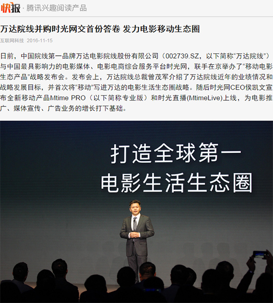 据悉,随着万达院线对时光网的并购工作完成,双方线上线下资源正在全面打通融合。短短4个月时间,时光网线上电商和万达线下的实体店已经实现了业务合并,统一品牌标识,统一后台管理,实现了衍生品O2O服务。同时,时光网团队全面接手万达院线的移动端产品技术开发,双方合并成同一个技术团队,最大化发挥协同效应,针对B端专业人士和C端观影用户打造全新移动产品。凭借过去10年的积累和与万达整合后的发力,时光网将凭借大数据服务和移动互联网,助力万达电影生态圈的构建。