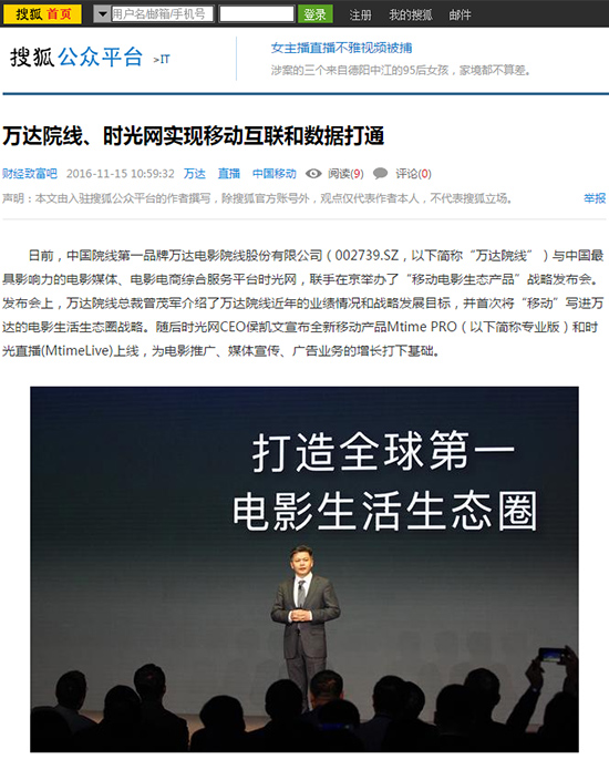 日前,中国院线第一品牌万达电影院线股份有限公司(002739.SZ,以下简称“万达院线”)与中国最具影响力的电影媒体、电影电商综合服务平台时光网,联手在京举办了“移动电影生态产品”战略发布会。发布会上,万达院线总裁曾茂军介绍了万达院线近年的业绩情况和战略发展目标,并首次将“移动”写进万达的电影生活生态圈战略。随后时光网CEO侯凯文宣布全新移动产品Mtime PRO(以下简称专业版)和时光直播(MtimeLive)上线,为电影推广、媒体宣传、广告业务的增长打下基础。