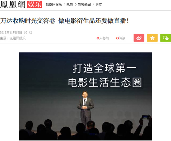 11月15日,时光网将独家承办电影《长城》五军发布会,也是时光直播的电影营销首秀:腾讯、斗鱼、熊猫、小米、今日头条等9家平台联动,6家万达影城大银幕同步直播,一票难求。