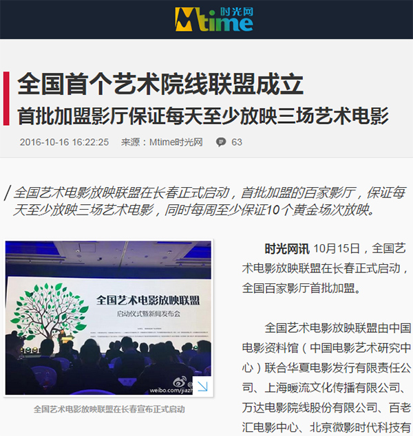 10月15日,全国艺术电影放映联盟在长春正式启动,全国百家影厅首批加盟。