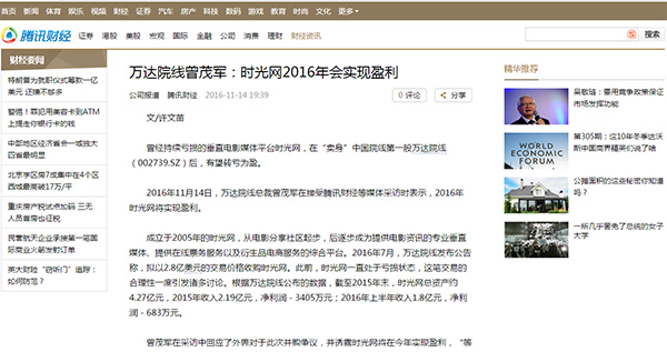 2016年11月14日,万达院线总裁曾茂军在接受腾讯财经等媒体采访时表示,2016年时光网将实现盈利。