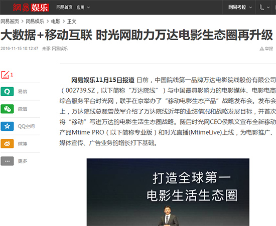 日前,中国院线第一品牌万达电影院线股份有限公司(002739.SZ,以下简称“万达院线”)与中国最具影响力的电影媒体、电影电商综合服务平台时光网,联手在京举办了“移动电影生态产品”战略发布会。发布会上,万达院线总裁曾茂军介绍了万达院线近年的业绩情况和战略发展目标,并首次将“移动”写进万达的电影生活生态圈战略。随后时光网CEO侯凯文宣布全新移动产品Mtime PRO(以下简称专业版)和时光直播(MtimeLive)上线,为电影推广、媒体宣传、广告业务的增长打下基础。