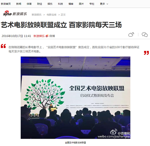 在刚刚闭幕的长春电影节上,“全国艺术电影放映联盟”宣告成立,首批全国31个省的100个影厅都将保证每天至少放三场艺术电影。