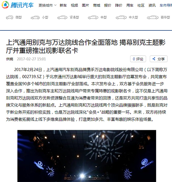 2017年2月24日,上汽通用汽车别克品牌携手万达电影院线股份有限公司(以下简称万达院线,002739.SZ)于北京通州万达影城举行盛大的别克主题影厅启幕发布会,共同宣布覆盖全国90多个城市的别克主题影厅全部落成。本次发布会上,双方基于会员服务进一步深入合作,推出为别克车主和万达院线用户带来专属特惠的观影联名卡,这不仅是上汽通用别克和万达院线双方优势资源整合互通为消费者带来的回馈,还是双方共同打造共享性的品牌文化与服务体系的新起点。上汽通用别克和万达院线两个顶尖品牌强强联手,既是别克对于新业务开拓的积极实践,也是万达院线深化"会员+"战略的重要一环。未来,双方将持续为消费者拓展线上线下多维度品牌体验,打造更加多元、丰富有趣的娱乐体验场景。