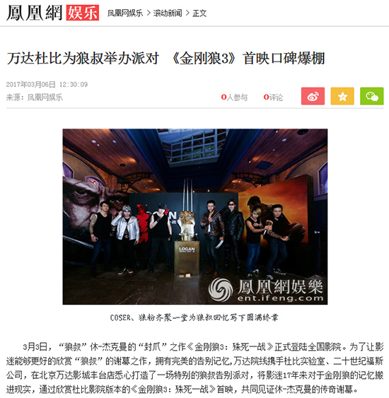 3月3日,“狼叔”休-杰克曼的“封爪”之作《金刚狼3:殊死一战》正式登陆全国影院。为了让影迷能够更好的欣赏“狼叔”的谢幕之作,拥有完美的告别记忆,万达院线携手杜比实验室、二十世纪福斯公司,在北京万达影城丰台店悉心打造了一场特别的狼叔告别派对,将影迷17年来对于金刚狼的记忆搬进现实,通过欣赏杜比影院版本的《金刚狼3:殊死一战》首映,共同见证休-杰克曼的传奇谢幕。