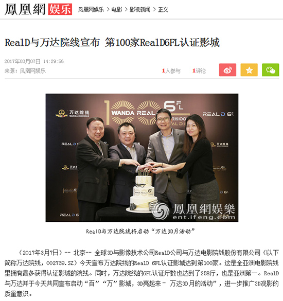 (2017年3月7日)-- 北京-- 全球3D与影像技术公司RealD公司与万达电影院线股份有限公司(以下简称万达院线,002739.SZ)今天宣布万达院线的RealD 6FL认证影城达到第100家。这是全亚洲电影院线里拥有最多获得认证影城的院线。同时,万达院线的6FL认证厅数也达到了258厅,也是亚洲第一。RealD与万达并于今天共同宣布启动“百”“万”影城,3D亮起来– 万达3D月的活动”,进一步推广3D观影的质量意识。