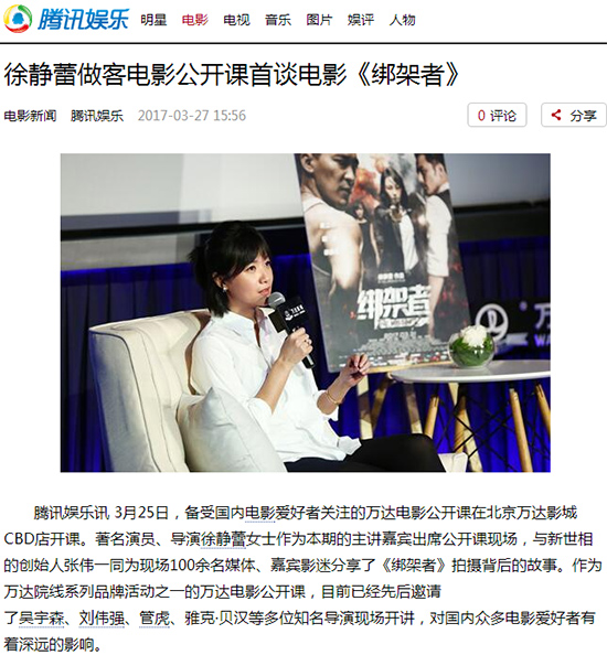 3月25日,备受国内电影爱好者关注的万达电影公开课在北京万达影城CBD店开课。著名演员、导演徐静蕾女士作为本期的主讲嘉宾出席公开课现场,与新世相的创始人张伟一同为现场100余名媒体、嘉宾影迷分享了《绑架者》拍摄背后的故事。作为万达院线系列品牌活动之一的万达电影公开课,目前已经先后邀请了吴宇森、刘伟强、管虎、雅克·贝汉等多位知名导演现场开讲,对国内众多电影爱好者有着深远的影响。