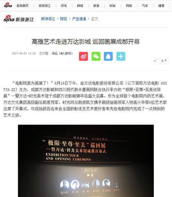 “电影院里办画展了!”6月16日下午,由万达电影股份有限公司(以下简称万达电影 002739.SZ)主办,成都万达影城和四川现代新水墨画院联合执行承办的“极限•至尊•至美巡回展”—暨万达•时光美术馆于成都万达影城锦华店盛大启幕。作为全球首个电影院内的艺术展,万达文化集团高级副总裁曾茂军、时光网总裁侯凯文携手超级油画领军人物高小华等6位艺术家出席了开幕式,与现场数百名来自全国的影迷及艺术爱好者率先在电影院内完成了一次特别的艺术之旅。
