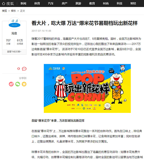 随着2017暑期档的来临,海量国产大片也将在7、8月震撼亮相。届时,全国万达影城除为影迷一如既往的准备了顶尖的视觉体验外,还别出心裁的推出了年度品牌活动——2017万达电影首届“爆米花节”。 该活动于7月10日已正式登录全国万达影城,截至8月31日,全国影迷可在400余家万达影城内体验到丰富的观影福利及卖品优惠活动。