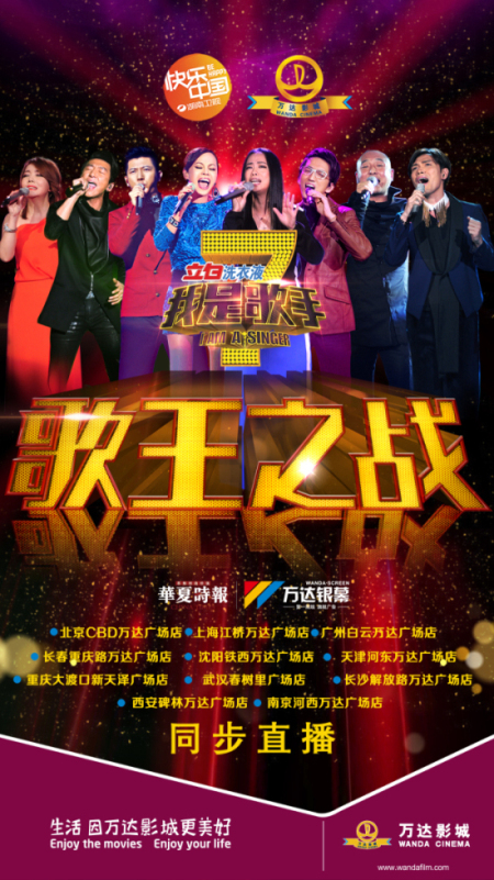 万达院线携手湖南卫视,直播4月12日晚间7点30分《我是歌手》总决赛,本次《我是歌手》通过节目高清信号的传输,在全国十一个城市的万达影城进行同步直播,近3000名观众通过影院直播,感受现场震撼。此次合作是开启电视节目影院直播新时代,得到社会各界广泛关注,也创新万达院线的营销模式。