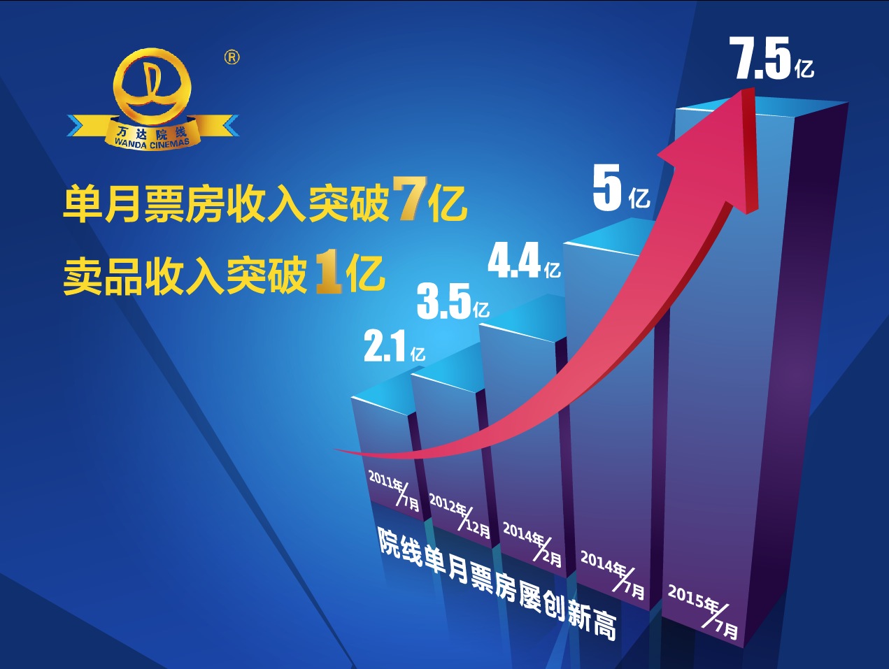 万达院线8月5日发布最新的经营简报。2015年7月,万达院线单月票房收入首次突破7亿大关,卖品收入首次突破1亿,票房收入同比增长49.6%。同时,观影人次也达到创历史新高的1941万人,同比增长63.6%。截止到7月31日,公司拥有已开业影院195家,1732块银幕。2015年1—7月,公司累计票房收入36亿元,同比增长啊44.6%,观影人次8418万人次,同比增长42.8%。凭借扎实的经营、持续的创新和资本化运作,万达院线继续领跑全行业,在票房收入、市场份额、观影人次等方面连续六年稳居全国第一。