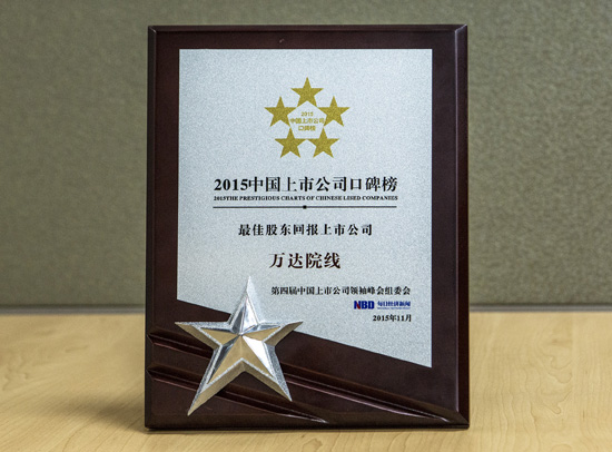 由《每日经济新闻》发起并主办的中国上市公司领袖峰会,于2015年11月6日-8日在成都举办。万达电影院线股份有限公司(简称“万达院线”,002739.SZ)获评为“2015中国上市公司口碑榜——最佳股东回报上市公司”。