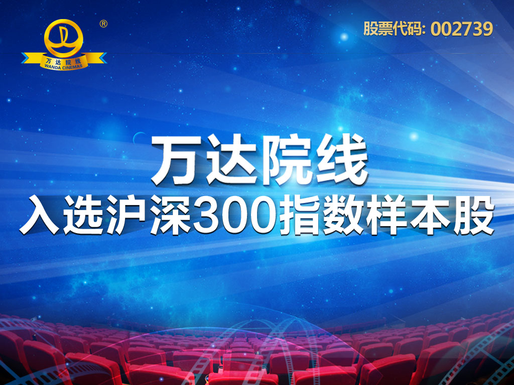 中证指数有限公司12月11日发布公告,万达电影院线股份有限公司(简称“万达院线”,002739.SZ),将于 2015 年 12 月 14 日正式成为沪深 300 精明指数样本股之一。 沪深300指数于2005年4月8日正式发布,由沪深两市A股中规模大、流动性好、最具代表性的300只股票组成,以综合反映沪深A股市场整体表现。