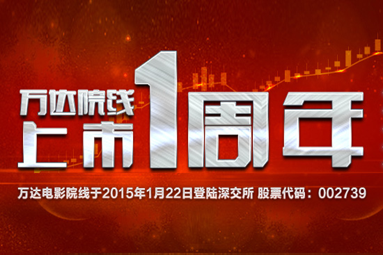 在2016年年初的集团年会上,王健林董事长特别提到万达集团今年完成了两件大事,其中一项就是万达院线成功上市,成为中国院线上市第一股,董事长说他看到脸谱上一个美国人写到:“世界上最好的公司就是万达院线,可惜美国人买不到”。2016年1月22日,万达院线(002739.sz)上市一周年,作为中国院线第一股,万达院线向投资者和公众交出一份完美的答卷: 2015年,万达院线已开业影城数292家,银幕总量达到了2557块,全年票房收入63亿元(含并购院线),占比超过14%,连续第七年成功登顶王座。从1月上市到2015年年底,股价上涨10.2倍,成为全球市值最大的院线,入选沪深300成份指数。在此上市一周年之际,万达院线更带来了海量的优惠活动回馈广大的会员和影迷。
