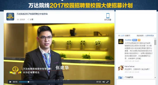 近日,万达电影院线股份有限公司(002739.SZ)2017校园招聘暨校园大使招募计划举行了以“小目标,大位来”为主题的空中宣讲会,直播了万达院线的公司简介、管培生招聘计划以及往届管培生经验分享,粉丝关注量突破2万人同时在线观看互动和宣讲视频。