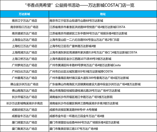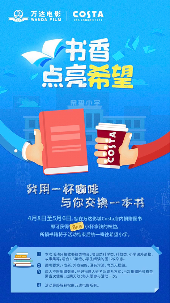 4月8日至5月6日,上海、南京、广州、佛山、成都、厦门、长沙七个区域的影迷可至当地万达影城COSTA门店参与“书香点亮希望“公益捐书活动,更多活动详情敬请关注当地万达影城官方平台,一起用公益点亮希望。